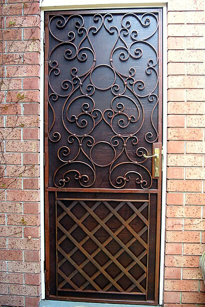 This design is part of our decorative scrollwork security door range. Each door is custom made to suit the doorway and finished in a choice of powder coat colours.